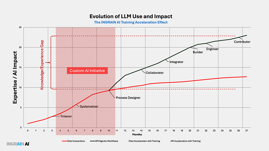 The two charts below make this easy to see. This chart shows what happens when companies try to figure out AI on their own. Progress is slow, employees stall out at low-impact roles, and thereās a wide knowledge gap that keeps the organization from moving forward. Even if someone in IT or marketing pushes a custom AI initiative, the lack of training across the rest of the business limits its success.